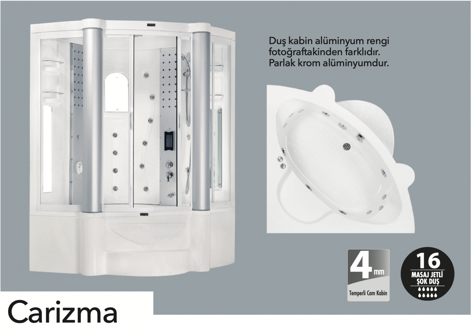 gaga + Akrilik tavan + 16 masaj jetli şok duş + 4 Adet krom kaplı şampuan korkuluğu + 4 yollu yönlendiricili batarya+Alüminyum oval kolonlar + Kumandalı küvet sifonu + Krom kaplı tepe duşu + 3 fonksiyonlu sürgülü el duşu + 5 adet ayna + Işıklı alüminyum pano 2 adet