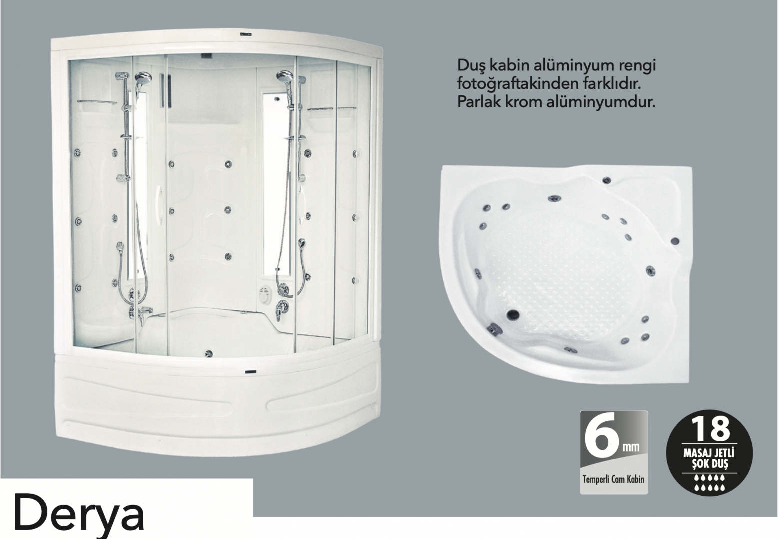- Seza panelle küvet + Lüx troyler 6 mm temperli kabin + Akrilik elyaf takviyeli duvarlar + Su verici gaga + Akrilik tavan + 18 masaj jetli şok duş + 2 Adet krom kaplı şampuan korkuluğu + 4 yollu yönlendiricili batarya (2 Adet) + Kumandalı küvet sifonu + Krom kaplı tepe duşu + 3 fonksiyonlu sürgülü el duşu (2 Adet) + 2 adet ayna