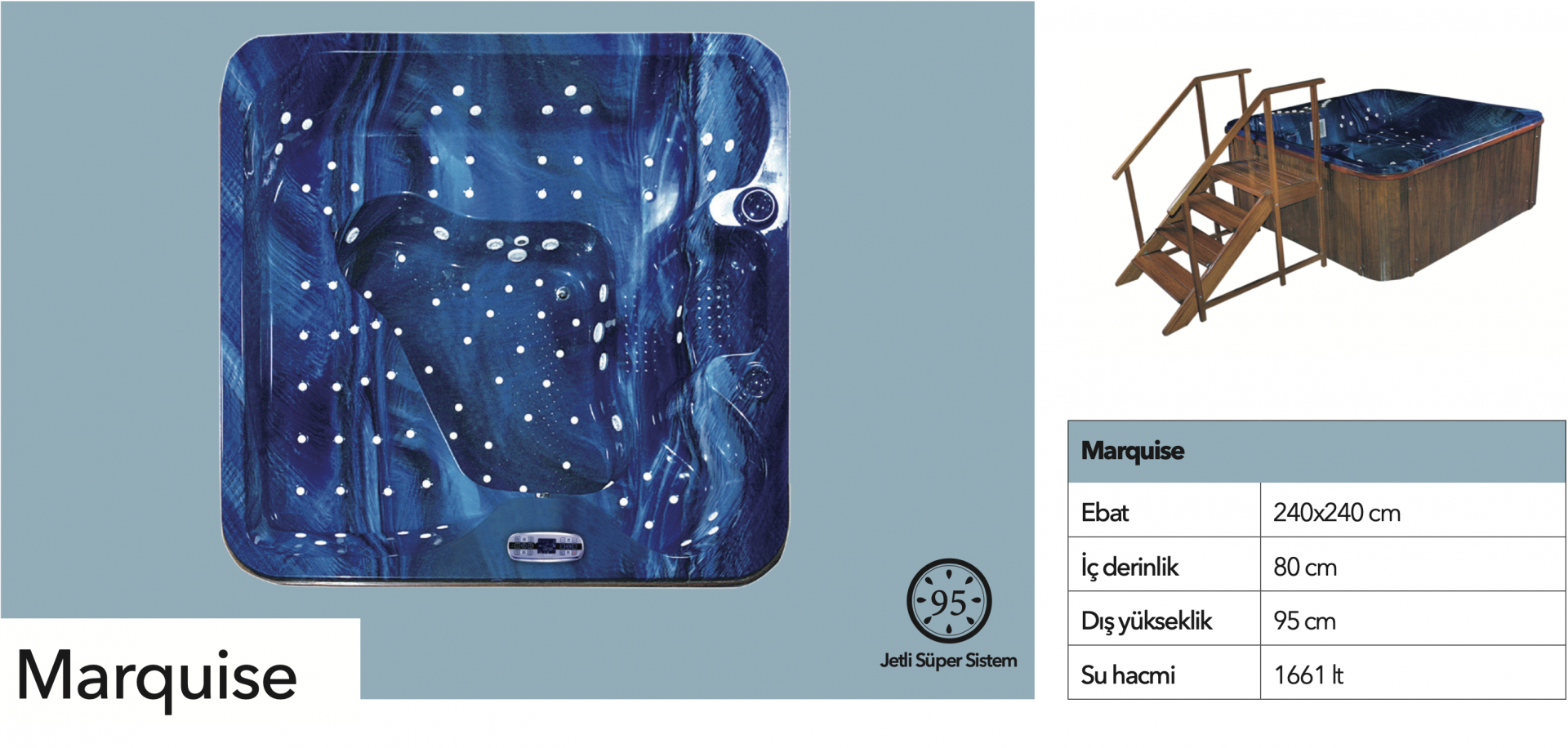 - Mermer desenli / Beyaz özel akrilikten gövde + Özel filitre takımı + 3 Adet 1.6 hp hidro masaj motor + 12 Adet yandan su jeti + 23 Adet sırt su jeti + 2 Adet su emiş süzgeci + 3 Adet 0,700 watt blower motoru + 60 Adet blower jeti + 2 Adet 7 renk değiştiren su altı led ışık + Sensörlü otomatik su tahliye sistemi + Su seviye sensörü ( 2 Adet ) + Özel elektirik panosu ve sigorta sistemi