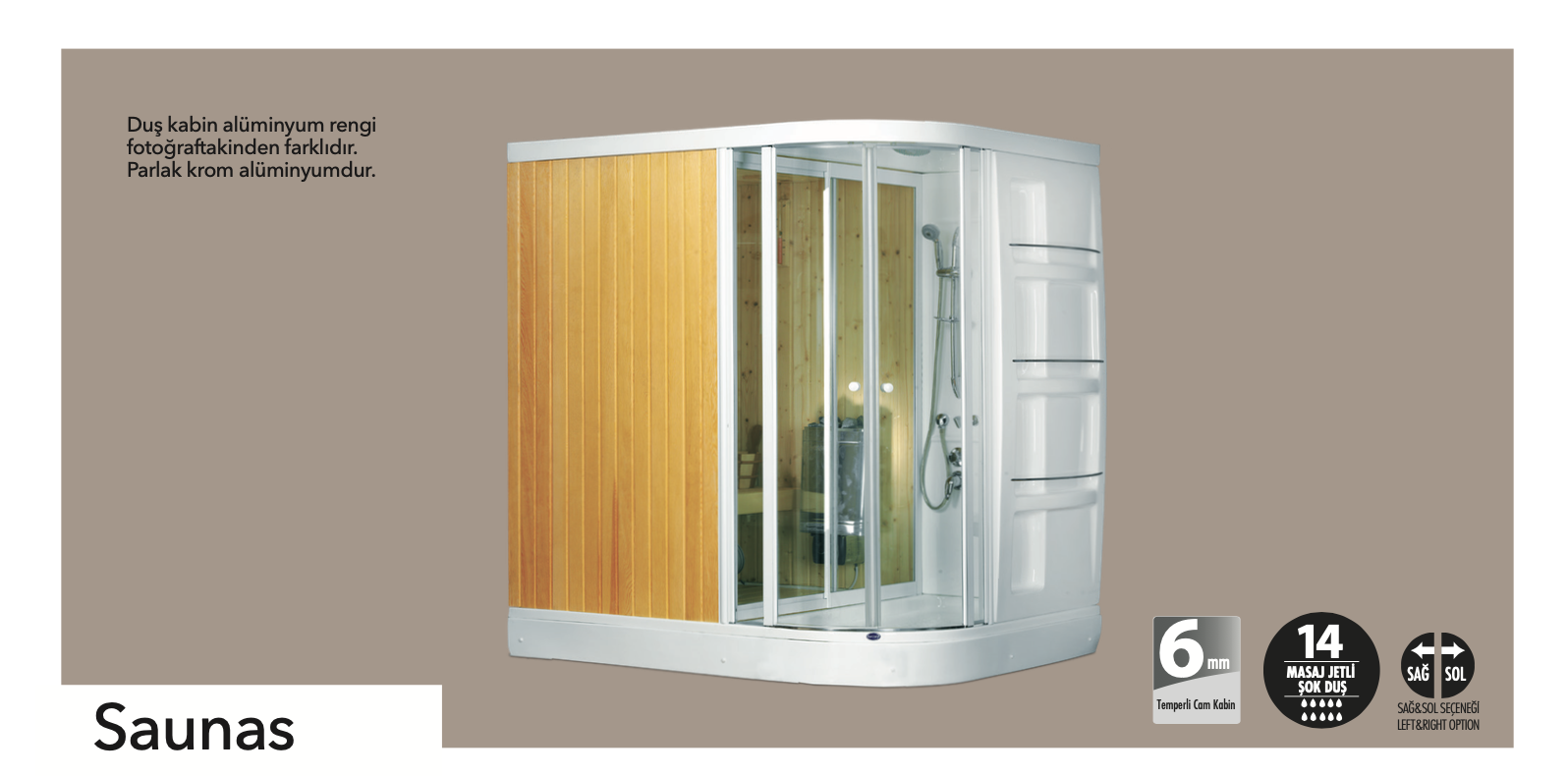 Panelli yekpare duş teknesi + Dış cephe lux troyler 6 mm temperli cam kabin + Termometre + Higrometre + Ahşap kaplama tavan + Ahşap kaplama zemin + Ahşap yan duvarlar + Ahşap su kovası + İç bölme lux troyler 4 mm temperli cam kabin + Sauna sobası + Volkanik taş + 500 ml esans + 1 adet ayna + Su verici gaga + Tavan lambası + Krom kapaklı duş tekne sifonu (2 Adet) + Tepe duşu krom kaplı kireç kırıcılı + 4 yollu yönlendiricili batarya + Çelik krom kaplı şampuanlık korkuluğu + 14 masaj jetli şok duş (Dış gövde AKDENİZ ÇAMI, İç gövde FİN LADİNİ, oturak ve ızgaralar ısınmayan APAÇİ ahşaptan yapılmaktadır) + Ahşap su kepçesi + Kum saati + Akrilik duvarlar + Akrilik tavan + Kireç kırıcılı 3 fonksiyonlu sürgülü el duşu + Apaçi ahşap oturak