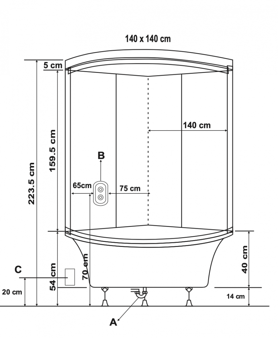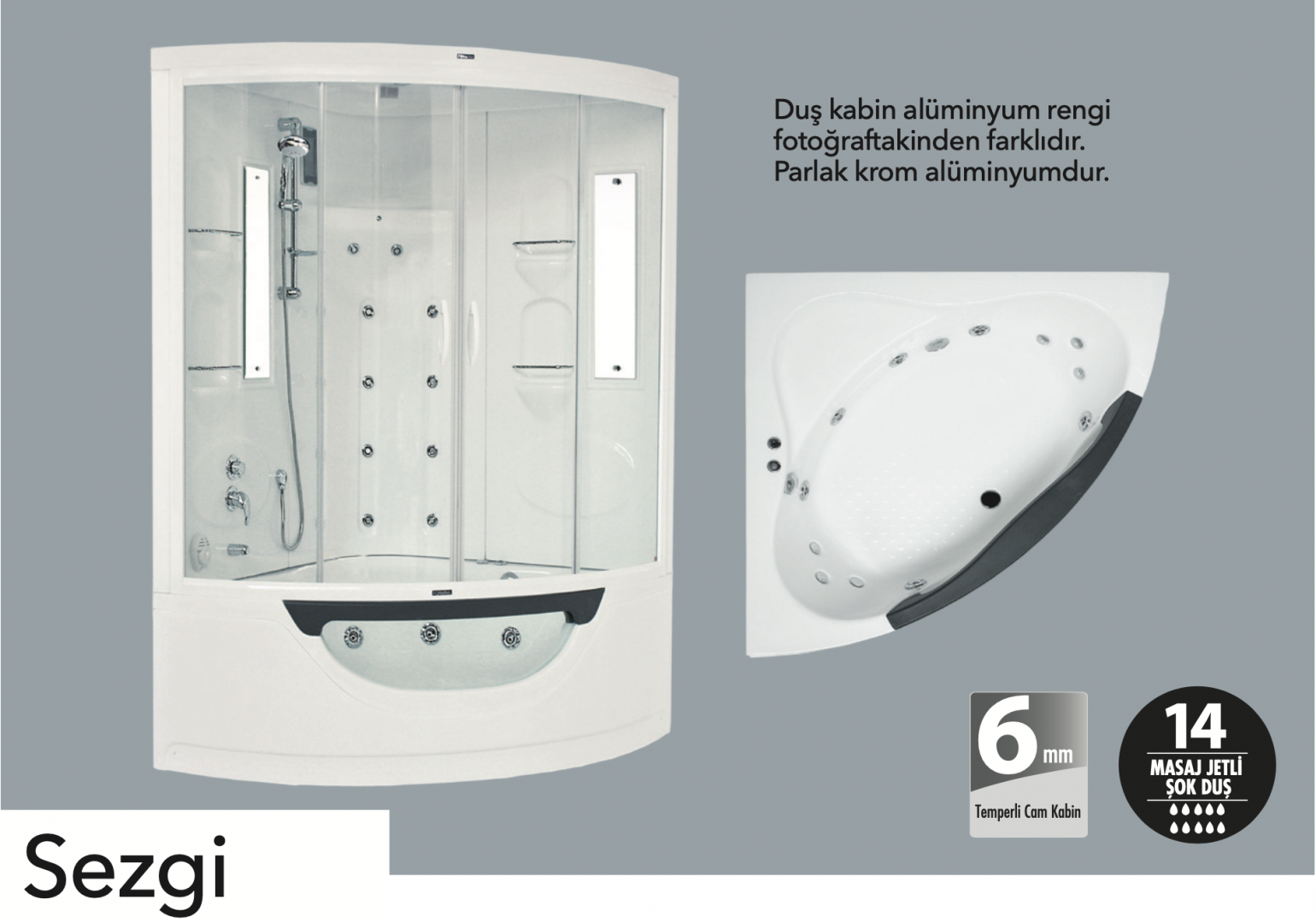 - Demas Panelli Küvet+ Lüx troyler 6 mm temperli kabin + Akrilik elyaf takviyeli duvarlar + Su verici gaga + Akrilik tavan + 14 masaj jetli şok duş + 4 Adet krom kaplı şampuan korkuluğu + 4 yollu yönlendiricili batarya + Kumandalı küvet sifonu + Krom kaplı tepe duşu + 3 fonksiyonlu sürgülü el duşu + 2 adet ayna